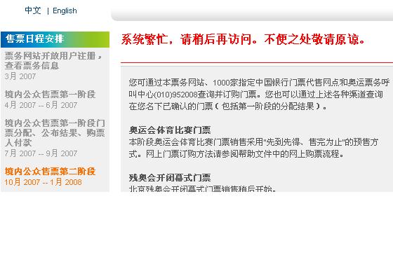 與第一階段抽簽決定門(mén)票獲得者不同,此次發(fā)售實(shí)行“先到先得,售完為止”的銷(xiāo)售政策。所以9點(diǎn)鐘剛過(guò),記者就嘗試打訂票熱線(xiàn),不過(guò)30分鐘后,記者還是沒(méi)有打通。記者隨后嘗試訪(fǎng)問(wèn)北京奧運(yùn)會(huì)官方票務(wù)網(wǎng)站,該網(wǎng)站顯示“系統(tǒng)繁忙,請(qǐng)稍后再訪(fǎng)問(wèn)。不便之處敬請(qǐng)?jiān)。”后?lái)讓其他朋友訪(fǎng)問(wèn),則干脆訪(fǎng)問(wèn)不了頁(yè)面。