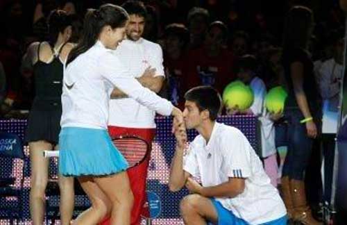 5歲的時候就認識,并且開始一起學習網球,德約科維奇和伊萬諾維奇可謂是青梅竹馬、兩小無猜,感情自然不是一般的深厚。眼見著如今20歲的小伊日漸出落成了一個大美女,小德也頗有些耐不住寂寞,就在澳網前夕,在家鄉(xiāng)貝爾格萊德的一場表演賽上,德約科維奇還當眾上演了“求婚秀”——在伊萬諾維奇面前單膝跪地,并且用哀求的眼光看著對方,最后還深情地吻了阿娜的手背,讓小美女“嚇”得不輕。