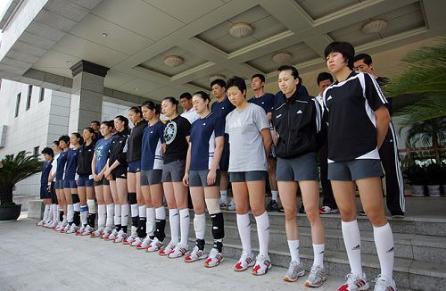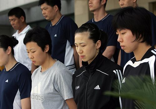 下午14時許,全隊一反平日午休的習(xí)慣,匯集在基地體育賓館大堂,姑娘們都刻意回避穿著那套紅色的運動服。14時25分,全體教練員、運動員在國家排球運動管理中心徐利主任的帶領(lǐng)下,在賓館外整齊列隊,徐利主任說:“根據(jù)國務(wù)院公告,為表達全國各族人民對四川汶川大地震遇難同胞的深切哀悼,中國女排隊為遇難者默哀。”14時28分寧波北侖空襲警報聲劃破長空,體育賓館外的馬路上,汽車笛聲四起,女排姑娘們神色凝重,低頭為7天前的這個時刻遭受地震劫難的人們默哀。