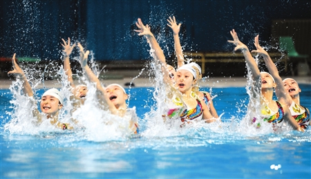 伴隨著悠揚的樂曲,水花蕩漾中美麗的“川花”姑娘翩翩起舞……昨晚,即將出征全國錦標(biāo)賽的四川花樣游泳隊在四川省游泳館進行了公開彩排,不少市民前來觀看,與這支美麗的花泳隊來了個近距離接觸。