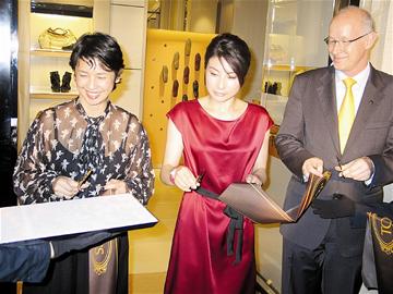剪彩完畢,在主人的引導(dǎo)下,郭晶晶參觀了這家商店。在一款女式皮包前,TOD’S亞太區(qū)主席對她說:“這與你那個(gè)國旗包包是同一款!