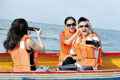 當(dāng)然,昨日彩排的時候,5位伴郎還沒有抵達(dá)三亞,而且楊威的海上旅程和楊云的空中旅程分開彩排。因此,在這一環(huán)節(jié),楊威、楊云和孫曉姣同坐一條艇,而本報兩名記者和楊威、楊云的隨行人員則客串伴郎分乘另外三條艇,來了一次海上“漫步”。