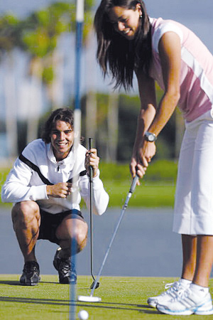 不過(guò)此組納達(dá)爾與伊萬(wàn)的高球互動(dòng)組圖更有“曖昧”的味道。在果嶺上,納達(dá)爾隨時(shí)幫忙糾正伊萬(wàn)的推桿動(dòng)作,而每次伊萬(wàn)將球推進(jìn)后,納達(dá)爾更是給出鼓勵(lì),在果嶺上帥男靚女的傳情更讓人浮想聯(lián)翩,難道這兩人才是“戀人”?
