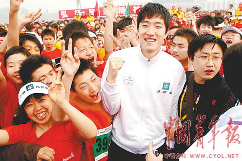 劉翔作為主辦方的代言人出現(xiàn)在主席臺上,原本他還要向北京智泉打工子弟學(xué)校的參賽學(xué)生贈送自己簽了名的長跑節(jié)T恤衫,但因為熱情的觀眾幾乎引起擁擠而被改在賽后進(jìn)行,就連事先約好的采訪也被迫取消。即便如此,“劉翔”、“劉翔”的喊聲還是持續(xù)了很長時間。