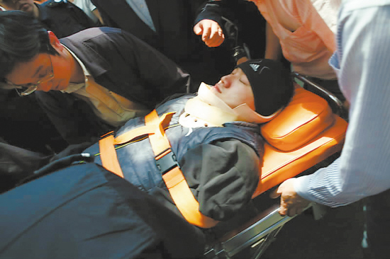 “帽子!借頂帽子!” 幾位先行下車的陪同人員,先從醫(yī)院保安那借了頂帽子。大約3分鐘后,車門才打開,躺在擔(dān)架上的湯淼被6名保安抬下車,并徑直送往病房——雖然氣溫高達(dá)27攝氏度,湯淼仍穿著大衣,戴著線帽,就連臉部也被那頂保安帽遮得嚴(yán)嚴(yán)實(shí)實(shí)。