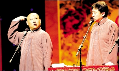 德云社的張德武、劉源以新編相聲《成長的煩惱》開場,他們拿馬諾在《非誠勿擾》中經(jīng)典的“寧愿坐在寶馬車?yán)锟,也不坐在自行車后面笑”砸掛,現(xiàn)場效果很好。郭德綱、于謙登臺合說了《夸住宅》,干脆利落的貫口贏得陣陣喝彩。走下臺的郭德綱說,搭檔于謙給了他不少驚喜,很多臨時發(fā)揮的話接得很到位。