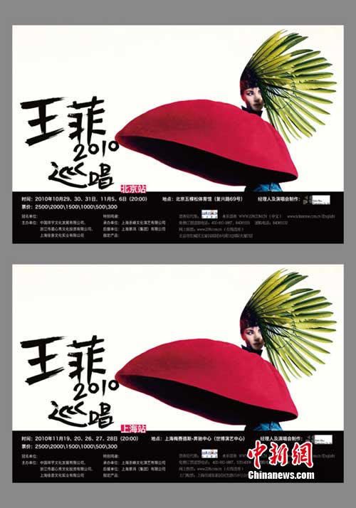 中新網7月9日電 王菲今年將在北京、上海兩地開十場演唱會,今日,演唱會海報曝光,天后身穿羽毛裝,造型十分獨特。