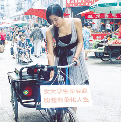 中新網(wǎng)7月23日電 “女大學(xué)生賣豆腐,許昌老豆腐,新鮮美味好吃不貴!”前天上午,河南鄭州市法院西街一個(gè)街市內(nèi),一名打扮時(shí)尚、樣貌酷似范冰冰的美女推著三輪車沿街叫賣豆腐,引得眾人圍觀。她說(shuō)從小就想做演員,但試鏡公司嫌她眼睛不好看、胸小,她希望藉賣豆腐“炒作自己,掙錢整容”。