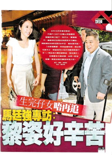 記者問他有沒有進產(chǎn)房陪太太,馬廷強說:“我沒進產(chǎn)房。黎姿要打麻醉針,加上我拄著拐杖,不是很方便,所以留在產(chǎn)房外等。她生完BB后從手術室出來,我就立刻去看她!