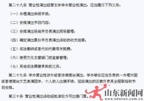 根據(jù)我國09年出臺的最新《營業(yè)性演出管理條例實施細(xì)則》第二十八條規(guī)定,營業(yè)性演出經(jīng)營主體舉辦營業(yè)性演出,應(yīng)當(dāng)履行辦理演出申報手續(xù)、安排演出節(jié)目內(nèi)容、接受文化主管部門的監(jiān)督管理等義務(wù)。緊接著,第三十條規(guī)定,營業(yè)性演出活動經(jīng)批準(zhǔn)后方可出售門票。在《細(xì)則》中還明確指出,跨省區(qū)演出的,應(yīng)當(dāng)出具其他演出所在地省級文化主管部門的審核意見。