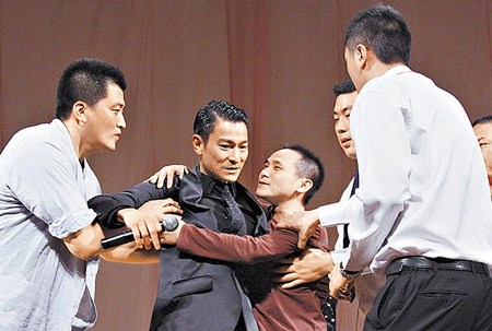 中新網(wǎng)9月21日電 電影《通天神探狄仁杰》前晚在北京大學(xué)舉辦首映,劉德華(華仔)、劉嘉玲、李冰冰、梁家輝都到場,活動進(jìn)行到一半,有位男粉絲竟沖上臺熊抱華仔,被保安強(qiáng)行拉下臺,華仔見狀連忙斥喝保安,要他們動作不要太粗暴,展現(xiàn)巨星風(fēng)范。