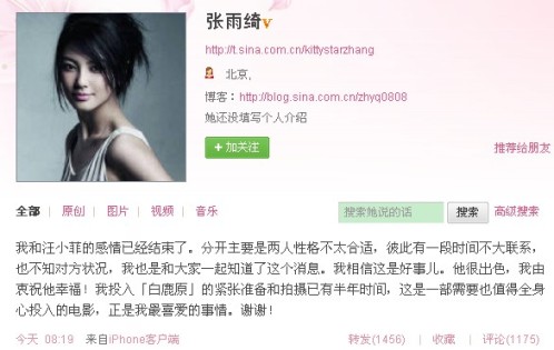 張雨綺在微博中表示:“我和汪小菲的感情已經(jīng)結(jié)束了。分開主要是兩人性格不太合適,彼此有一段時(shí)間不大聯(lián)系,也不知對(duì)方狀況,我也是和大家一起知道了這個(gè)消息。我相信這是好事兒。他很出色,我由衷祝他幸福!我投入《白鹿原》的緊張準(zhǔn)備和拍攝已有半年時(shí)間,這是一部需要也值得全身心投入的電影,正是我最喜愛的事情。謝謝!”