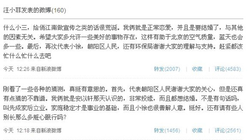 此后汪又再次追發(fā)微博,表示“什么小三,給飯店做宣傳之類的話很荒誕。我倆就是正常戀愛,并且是要結(jié)婚了,與其他的因素?zé)o關(guān)。希望大家多允許一些美好的事物存在,這樣有助于北京的空氣質(zhì)量,藍(lán)天也會(huì)多一些。最后,再次代表小徐,朝陽區(qū)人民,還有環(huán)保局謝謝大家的理解與支持。趕緊都該忙什么忙什么去吧。”