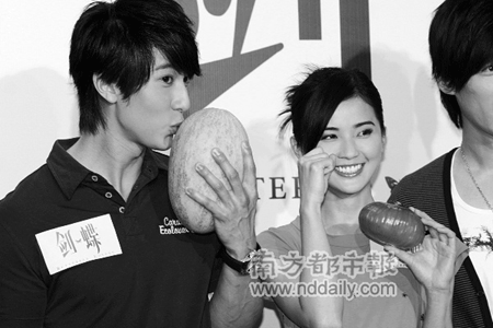 昨天下午,《劍蝶》劇組在北京舉行媒體答謝酒會(huì),導(dǎo)演馬楚成率阿SA、吳尊、胡歌等主創(chuàng)亮相。《劍碟》即將殺青,答謝會(huì)也成了劇組人員的告別宴,劇組準(zhǔn)備了一筐蔬果做告別禮物,阿SA和吳尊給對(duì)方挑的禮物,讓人不禁啼笑皆非。