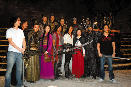 走進(jìn)攝影棚,首先看到兩邊搭起了一座插滿劍的高臺(tái)。臺(tái)階下,飾演絕無(wú)神的任達(dá)華和幾名飾演武林俠士的群眾演員正在拍一場(chǎng)打戲。這場(chǎng)戲說(shuō)的是,絕無(wú)神把步驚云和聶風(fēng)等人捉住了,武林俠士們決定合力和絕無(wú)神決一死戰(zhàn),以求救出步、聶兩人。一個(gè)鏡頭拍了好幾次,完成后,身穿鎧甲的任達(dá)華已經(jīng)大汗淋漓,他痛苦地?cái)D著臉部肌肉,指著勒緊了脖子的戲服說(shuō):“無(wú)法呼吸了,(這衣服)只有三個(gè)口出氣。”任達(dá)華在戲里只有這一套重25公斤的皮制衣服,在泰國(guó)拍了12天,每天都要穿著它12個(gè)小時(shí)。