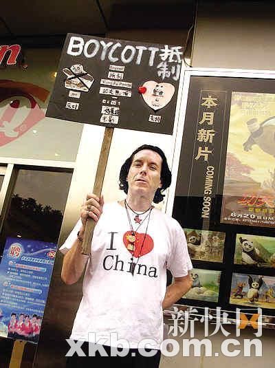 一位網(wǎng)友在他的博客中介紹了事情的經(jīng)過:“在北大教書的美國(guó)人Tim Lies和他的中文翻譯日前來到位于北京北三環(huán)的華星國(guó)際影城,手舉著一個(gè)寫著‘BOY-COTT 抵制’的牌子開始了他抵制好萊塢電影《功夫熊貓》的實(shí)際行動(dòng)。他希望中國(guó)電影不要變成第二個(gè)好萊塢。”