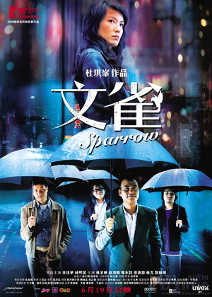 《文雀》不單看起來(lái)不像杜琪峰,連“聽”起來(lái)都讓人有這種感覺。杜琪峰以前寧愿用一些冷酷的臺(tái)詞來(lái)點(diǎn)燃靜默的鏡像,很少會(huì)在影片里用太多的音樂(lè)來(lái)烘托全片!段娜浮穭偤孟喾,臺(tái)詞少、音樂(lè)多,這一點(diǎn)倒也跟王家衛(wèi)有點(diǎn)像。在影片開始的一段里———任達(dá)華一句話都沒說(shuō),縫完衣服,一只小鳥飛了進(jìn)來(lái),他釋放它之后小鳥又飛了回來(lái),他笑了笑,就推單車出門了。直到任達(dá)華騎車穿過(guò)長(zhǎng)長(zhǎng)的街,到達(dá)茶餐廳和其他三個(gè)賊同伙見面之后,他才開口說(shuō)話。
