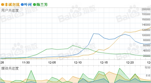 而對于其他幾部影片,“葉問”的搜索量排在第二,最高的時候逼近10萬,但已經(jīng)呈現(xiàn)下滑趨勢,好在網(wǎng)友對它的評價極好,幾乎一致的贊不絕口,這將幫助拉動其后期票房;“赤壁”將于1月8日上映,目前其搜索次數(shù)還很少,大致在1萬多徘徊,百度的數(shù)據(jù)預(yù)測它可能達(dá)不到《赤壁上》3億多的票房記錄;“梅蘭芳”上映時間最早,網(wǎng)民的搜索次數(shù)已經(jīng)持續(xù)走低,預(yù)計其票房將排名第四;至于“女人不壞”,目前網(wǎng)民的日搜索量僅1萬多,盡管網(wǎng)友的口碑極好,但預(yù)期也較低。