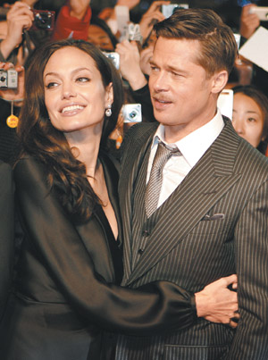 皮特與茱莉約在東京時(shí)間傍晚6點(diǎn)10分抵達(dá)六本木戲院,兩人一路恩恩愛愛,“星光大道”也成了兩人“愛的大道”。