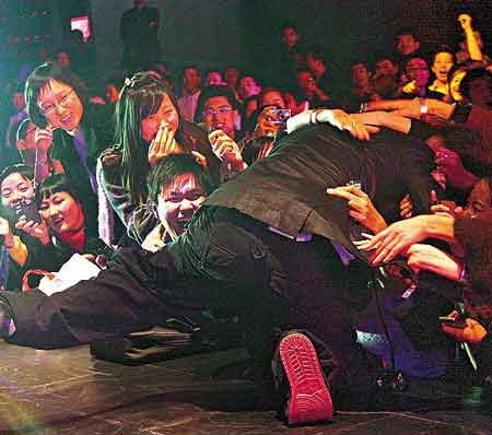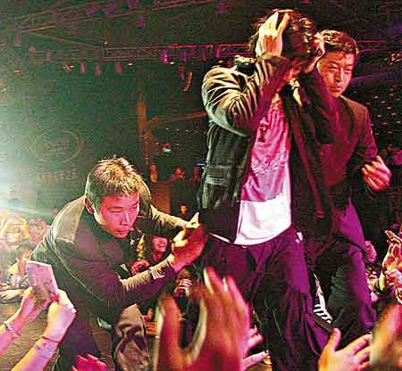 但歌迷仍未心息,保安于是與歌迷展開一場拔河賽,力宏就是那條“繩索”,幾經(jīng)拉扯之后,保安才成功將力宏拉回臺上,他一臉驚慌地用手掩頭,不過專業(yè)的力宏驚魂未定便繼續(xù)獻唱,但明顯已小心地跟觀眾席保持距離,后來走近與歌迷擊掌也小心翼翼,表演完畢即由兩名保安簇擁離場。