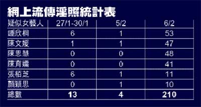 發(fā)放者先于昨日凌晨約1時(shí)30分傳出一張疑似顏穎思的淫照,直至昨午1時(shí)半,共210張淫照以zipfile(壓縮檔)形式經(jīng)電郵傳出,其中疑似鍾欣桐的照片最多,達(dá)53張(見表)。前晚開始更陸續(xù)有網(wǎng)友聲稱看過(guò)一段約32分鐘有關(guān)陳冠希與一名女藝人的短片。