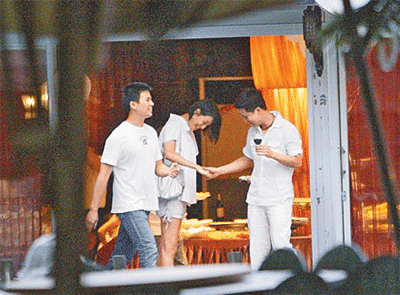 Mike左手(右)拿著紅酒,右手摸著賈永婕的手,似乎想沾懷男胎好運(yùn)。