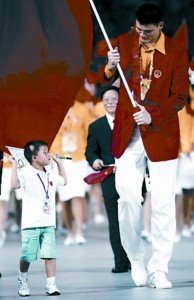 運動員入場,頭上有個疤痕的小男孩牽著姚明的手步入,開心地?fù)]手。他是林浩,他的父親林大坤在接受晨報記者采訪時透露,開幕式結(jié)束后,林浩用“很自卑”形容自己和姚明走在一起的感受,原話是:“我很自卑。他是全場最高的人,我是全場最矮的人!