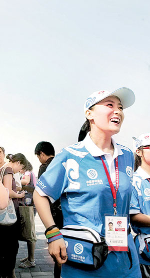 昨天,歌手譚晶來(lái)到鳥巢旁的志愿者服務(wù)站,履行她作為奧運(yùn)志愿者的義務(wù)。