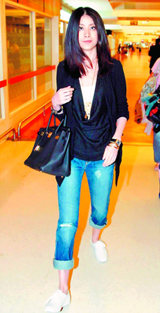 陳慧琳手提價值近8萬港幣的愛瑪仕黑色皮手袋去臺灣開工,她笑稱:“這包有一半來自雷頌德的禮金。”