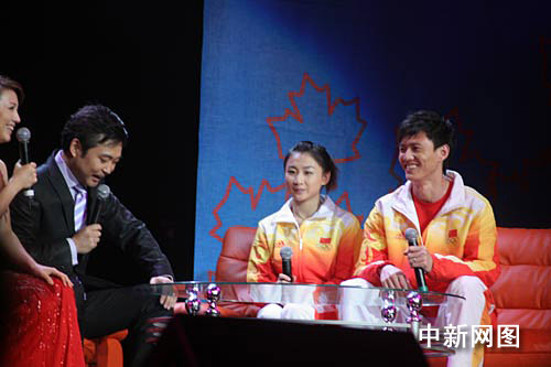 北京奧運(yùn)冠軍仲滿、何雯娜在演出現(xiàn)場與觀眾互動。