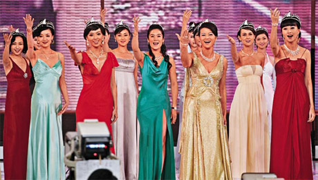 27位歷屆亞姐戴上后冠、穿上低胸裝在臺(tái)上高歌。