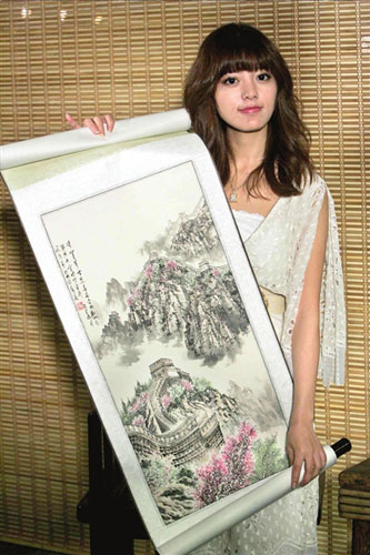 昨天,歌手阿蘭在北京展示吳宇森贈(zèng)送給她的水墨畫(huà)《長(zhǎng)城春色》。阿蘭還透露,《赤壁(下)》的主題曲為《大江東去》,由日本作曲家?guī)r代太郎操刀。吳宇森夸阿蘭唱出了電影的豪情。記者張偉 易東方 攝