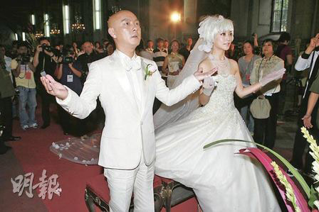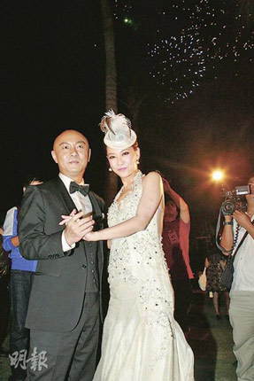一對(duì)新人在酒店筵開(kāi)18席,現(xiàn)場(chǎng)又大放煙花,歷時(shí)5分鐘,在浪漫的環(huán)境下,一對(duì)新人忍不住擁抱四目交投,兩度熱吻。結(jié)婚蛋糕共3層,外層的糖衣由粉紅玫瑰和100粒水晶點(diǎn)綴,花了兩日時(shí)間制成,價(jià)值600元美金,整個(gè)婚禮豪花約500萬(wàn)港元。酒會(huì)前一對(duì)新人先接受訪問(wèn),新郎張衛(wèi)健坦言整個(gè)婚禮都十分緊張,還以為自己未讀完誓辭,就跟神父講還未讀完,但神父提他已讀完,余下是新娘子讀,兼且他又?jǐn)[烏龍幫太太戴錯(cuò)戒指在右手。張衛(wèi)健說(shuō):“以前不信新娘結(jié)婚當(dāng)天是最漂亮的,原來(lái)是真的!彼Q婚后他首要學(xué)習(xí)如何白頭到老,他更羨慕一對(duì)老人家手拖手行街,希望將來(lái)都可以做到。