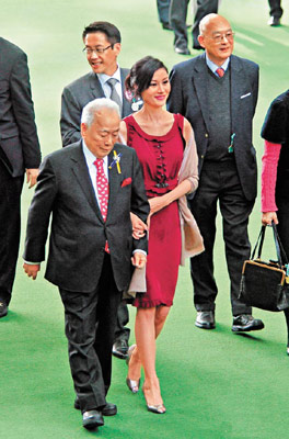 中新網(wǎng)2月2日電 許家新抱李嘉欣踏入牛年終于現(xiàn)身,昨日初七“人日”她以一身紅裙示人,盛傳懷孕的她明顯肚凸凸,與丈夫許晉亨及公公婆婆到沙田馬場(chǎng)觀戰(zhàn),結(jié)果許家名下兩匹愛駒跑第一,一日連拉兩次頭馬,可見嘉欣風(fēng)頭勁旺。許家喜事重重,難怪一向表現(xiàn)低調(diào)的許老太也罕有地眉開眼笑。