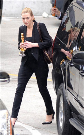 凱特·溫絲萊特對(duì)于自己的奧斯卡影后的稱(chēng)號(hào)也是相當(dāng)激動(dòng),下面小編給大家?guī)?lái)一組圖片,大家可以看到,影后拿著小金人一直不肯撒手,生怕碰壞,可以看得出她是多么重視這個(gè)獎(jiǎng)項(xiàng)了吧。順便說(shuō)一下影后的穿著,一身黑色職業(yè)性濃厚,干練的盤(pán)發(fā)透出影后的氣勢(shì)。