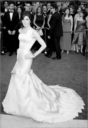 漢森在《返老還童》中飾演本杰明·巴頓的母親。與托梅相似的是,漢森當(dāng)日也身著白色長裙。這套羅伯托·卡瓦利的無肩帶及地長裙采用了不規(guī)則的花邊設(shè)計。兩家媒體都認(rèn)為,長裙、項鏈和利落的發(fā)型將漢森映襯得光彩照人。