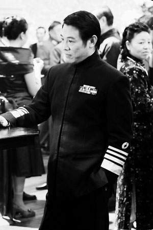 李連杰飾演的國民黨海軍一級(jí)上將陳紹寬近日在媒體上曝光。他身著一套深海藍(lán)色的中山裝式的海軍禮服,袖子上帶有明黃色的軍官袖標(biāo),沒有肩章,胸口則別著彩色的軍章。執(zhí)行導(dǎo)演說,李連杰這次是超級(jí)“龍?zhí)住保谄兄挥?句對(duì)白。