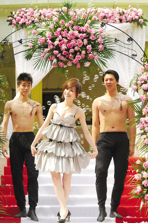 從加長“悍馬”下來后,大家才發(fā)現(xiàn)眼前的王心凌跟過去的學(xué)生妹形象有了很大改觀,因為她一襲露胸裙裝,還常常低首,露出春光無限,現(xiàn)場的港臺記者攝像機(jī)更是拍個不停。特別值得一提的是,引領(lǐng)這位“甜蜜教主” 登上布滿粉紅玫瑰花瓣紅毯的,是兩個裸露上身的男舞者,而記者們喝的茶是特制的桃花茶,整個發(fā)布會,可謂是“桃色”意味濃厚。