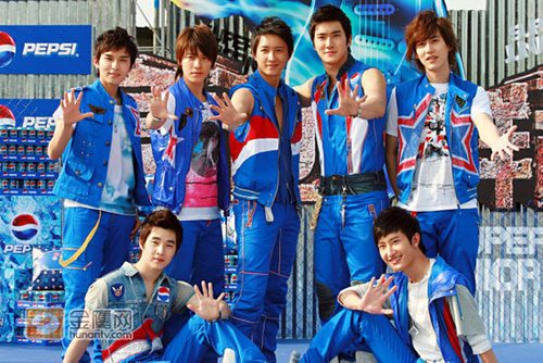 由中國成員韓庚領(lǐng)軍的超人氣男子組合Super junior-M出席某飲料簽約儀式,正式加入這個規(guī)模龐大的品牌家族。這支2008年4月在中國出道的韓國花美男組合目前已在中韓兩國都掛起了一陣颶風(fēng),這次發(fā)布會現(xiàn)場更是吸引了多達(dá)二百多位粉絲身著SJ的守護色寶藍(lán)色,早早在機場守候。大會安排了三十多名保安護駕護航,足以彰顯SJ-M的超高人氣。