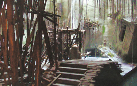 洞內(nèi)燈火通明,卻很陰冷潮濕,時(shí)不時(shí)聽到滴滴答答的水聲,十幾個(gè)工人正在忙碌著趕制道具。一位工人師傅告訴記者,“我們已經(jīng)在這里忙活兩個(gè)月了,洞內(nèi)的所有木頭橋、破房子、還有垂掛下來的藤條等等,全是人工打造的。”