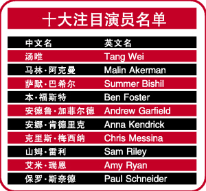 此次入圍十大注目演員的還有西部片《決斗猶馬鎮(zhèn)》的本•福斯特,他在影片中飾演反派羅素•克洛的手下,奸得令人心寒;之前,他還參演過《X戰(zhàn)警3》,飾演一名長(zhǎng)有翅膀的戰(zhàn)警。此外,入圍的還有主演傳記電影《Control》的男主角山姆•雷利、本•阿弗列克導(dǎo)演處女作《失蹤人口》的女星艾米•瑞恩、與布拉德•皮特同臺(tái)演出《刺殺神槍手》的保羅•施奈德等。