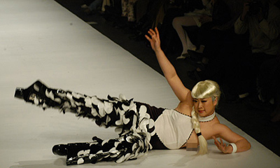 趙半狄早在發(fā)布會前就曾透露,芙蓉姐姐將穿著他設計的網(wǎng)絡紅人服出場。在時裝展示中,芙蓉姐姐頭帶金黃假發(fā)辮,身著黑白相間美人魚服裝熱舞出場,擺出各種夸張的造型。并且由于舞蹈動作過大,芙蓉姐姐頻頻“露點”。