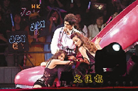 據(jù)香港文匯報(bào)報(bào)道,“周杰倫2007世界巡回演唱會”香港站的七場演出已于前晚大功告成,周杰倫獻(xiàn)唱《夜曲》時(shí),名模姚書軼和另一性感舞蹈員從旁伴舞,她們不停做出誘惑動作,不僅掃摸他身體,更甚是伸手在周杰倫的大腿內(nèi)側(cè)位置掃過去,差點(diǎn)觸及周杰倫重要部位,周杰倫被嚇得用手撥開對方。最搞笑是立刻以手掩護(hù)住下,可能周杰倫給熱情的女伴舞者所帶動,隨之開放起來,當(dāng)女伴舞者把頭躺在周杰倫的大腿時(shí),他索性把對方的頭按下,差點(diǎn)觸碰到下體,令現(xiàn)場觀眾叫囂不絕。