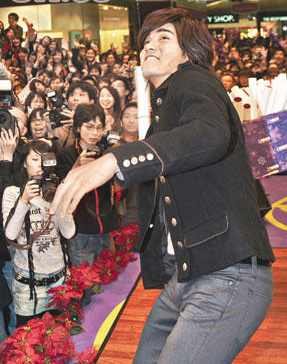 據(jù)香港太陽(yáng)報(bào)報(bào)道,臺(tái)灣人氣偶像賀軍翔(小美)前晚與鐘嘉欣及徐子珊等到上水廣場(chǎng)出席倒數(shù)活動(dòng),吸引百人逼爆商場(chǎng),場(chǎng)面熱鬧。小美出盡“媚”功,與Fans重演劇集《惡魔在身邊》及《玩玩愛》的經(jīng)典場(chǎng)面,包括拖手共舞、跪地求婚、甜蜜互喂及用衫為Fans遮風(fēng)擋雨。由于小美于上月二十八日生日,F(xiàn)ans以普通話及英語(yǔ)唱生日歌祝賀!
