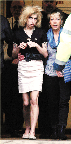 美國有“癲后”布蘭妮長(zhǎng)期霸占娛樂版面,英國則有“毒后”艾米·懷恩豪斯制造新聞點(diǎn)。上周五她在審訊結(jié)束前5分鐘趕到法庭,為被控傷人及行賄等罪名的25歲老公Blake打氣,還公然于庭上高喊:“老公我愛你!你是最靚仔有型的!”送給Blake一顆定心丸,有目擊者就表示,Blake隨即以口形回應(yīng):“你怎樣啦?”艾米只懂不斷重復(fù):“愛你!愛你!”恩愛得旁若無人。不過艾米當(dāng)天邋遢異常,蓬頭垢面甚至穿著殘舊芭蕾舞鞋就來到法庭了。