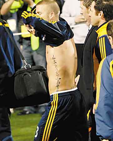 身為美劇《越獄》男主角邁克的鐵桿粉絲,大衛(wèi)·貝克漢姆正積極模仿他的偶像:把自己的身體文滿文身。近來隨著洛杉磯銀河隊到訪中國的上海和香港,小貝的身上也留下了中國的印記——增加了肋部的一行中國文字。