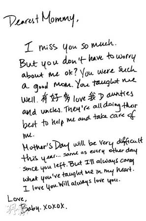 無法要求肥姐再做“母親節(jié)”專訪,所以《明報(bào)》轉(zhuǎn)托欣宜把肥姐的愛延續(xù)下去,記者寫到,當(dāng)欣宜靜靜地在寫給媽咪的信時(shí),我看她的眼淚一直在流,心里真的好痛,就因一個(gè)病,把一對(duì)相依為命的母女永遠(yuǎn)分開了,欣宜就要一個(gè)人地走下去,看到她這封信寫著“親愛的媽咪,我好掛念你,但你不用掛心我,你是一位好母親,教導(dǎo)我好好成長,有好多愛我的姨姨與叔叔,他們都盡心盡力照顧我。今年的母親節(jié)對(duì)我來說非常之不同,就如你已離開我的每一天一樣,不過我永遠(yuǎn)都記得你教我的一切,你永遠(yuǎn)都在我心里面。我愛你!一直一直的愛你!Baby(肥姐對(duì)欣宜的昵稱)”