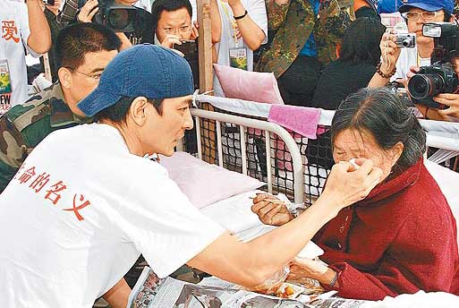 在寺院逗留個(gè)半小時(shí)后,他們又到重災(zāi)區(qū)綿竹一間工廠探訪,工廠負(fù)責(zé)人帶眾星參觀,工人看見華仔、陳道明和葛優(yōu)等紅星顯得很開心。為工人打氣后,他們又到臨時(shí)安置區(qū)和臨時(shí)醫(yī)院探訪,醫(yī)護(hù)人員和病人看見華仔等人歡喜若狂,其中華仔在醫(yī)院跟一名75歲老婆婆聊天,老婆婆已接近盲,不知道探望她的是位紅星。老婆婆在地震時(shí)受傷致骨折,她向華仔哭訴,孫女在地震中死亡,華仔見到她如此傷心,也不禁流下男兒淚,但仍不斷安慰婆婆和為她拭淚,還承諾會(huì)照顧她。