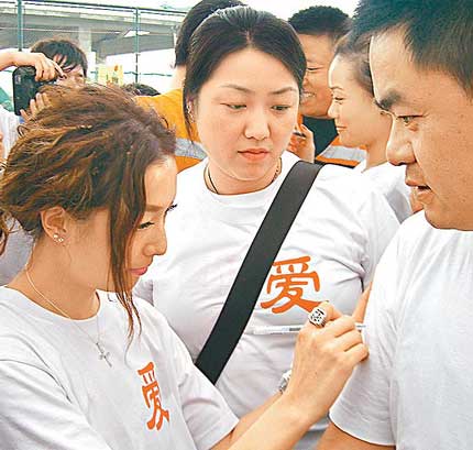 至下午3時(shí)多,他們到成都一間消防局為數(shù)百名消防員打氣,他們是首批進(jìn)入災(zāi)區(qū)徒手在瓦礫中救出幾百名傷者的英雄,華仔和Sammi帶頭向這班消防英雄敬禮。Sammi說:“第一隊(duì)人入災(zāi)區(qū)以血汗救人,這些人是真英雄。”華仔則說:“5.12地震發(fā)生后,我先知道內(nèi)地消防員是這樣,她們不顧自己安危,我真是好敬佩!