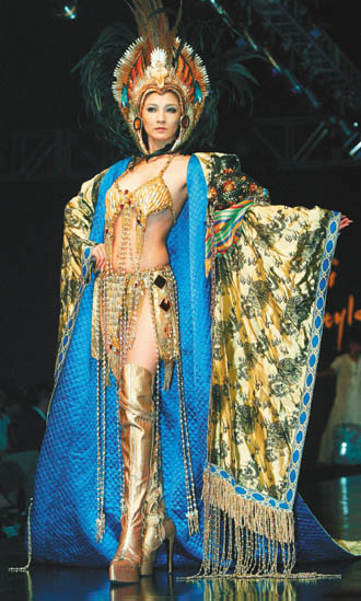 中新網(wǎng)7月14日電 據(jù)臺(tái)灣媒體報(bào)道,臺(tái)灣名模陳思璇昨天金光閃閃走秀,后臺(tái)同事見到她都搖頭嘆息:“錢真難賺!”因?yàn)樗念^飾很重,又要粘假胡子,里面還穿金色比基尼,舉手投足、氛圍掌握都是巨大挑戰(zhàn)。陳思璇笑說:“我盡量想成在拍電影‘滿城盡帶黃金甲’啦!